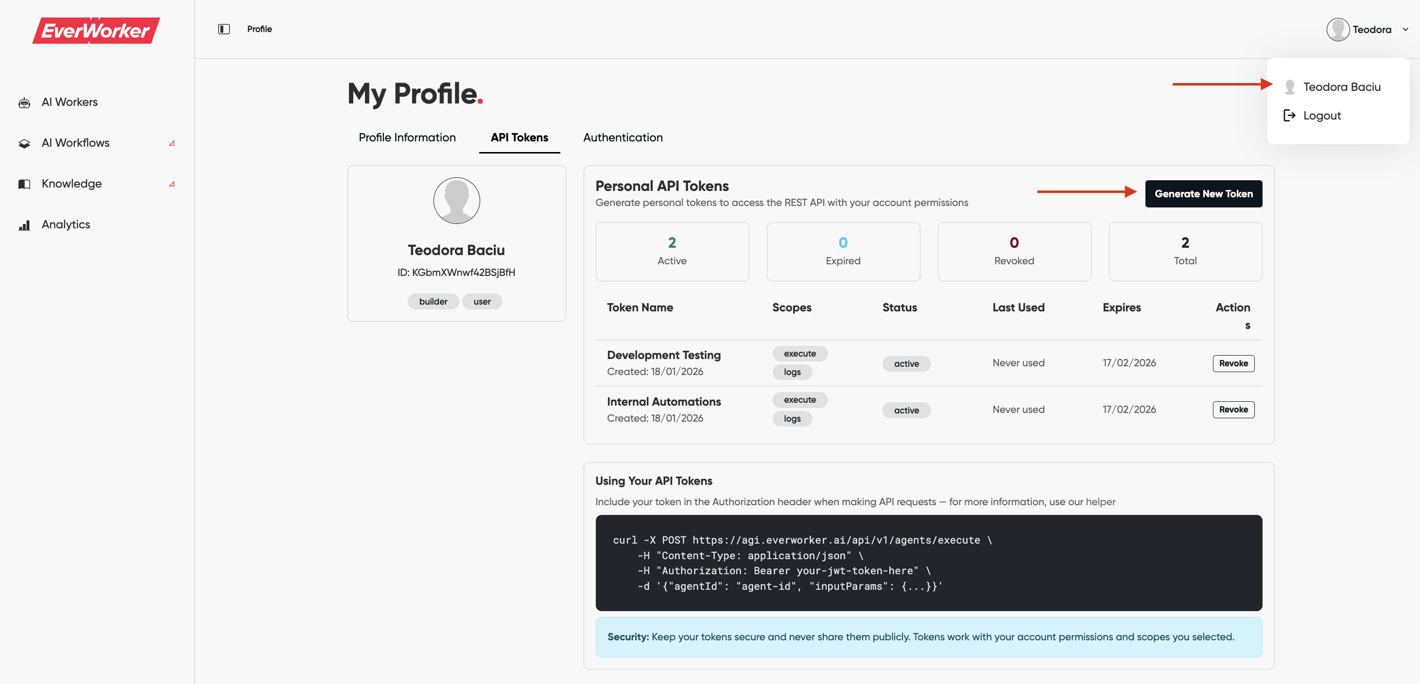 In order to be able to execute API requests towards the platform, a user must access their profile (top right corner button with a dropdown), switch to "API Tokens" tab and generate a new token with a custom name and expiration date.