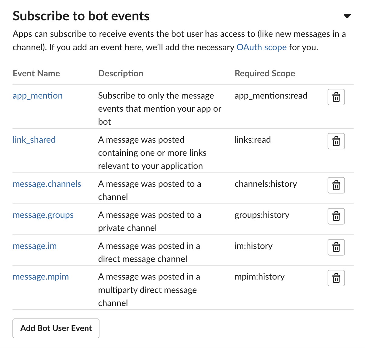 Click Subscribe to bot events to expand the section.