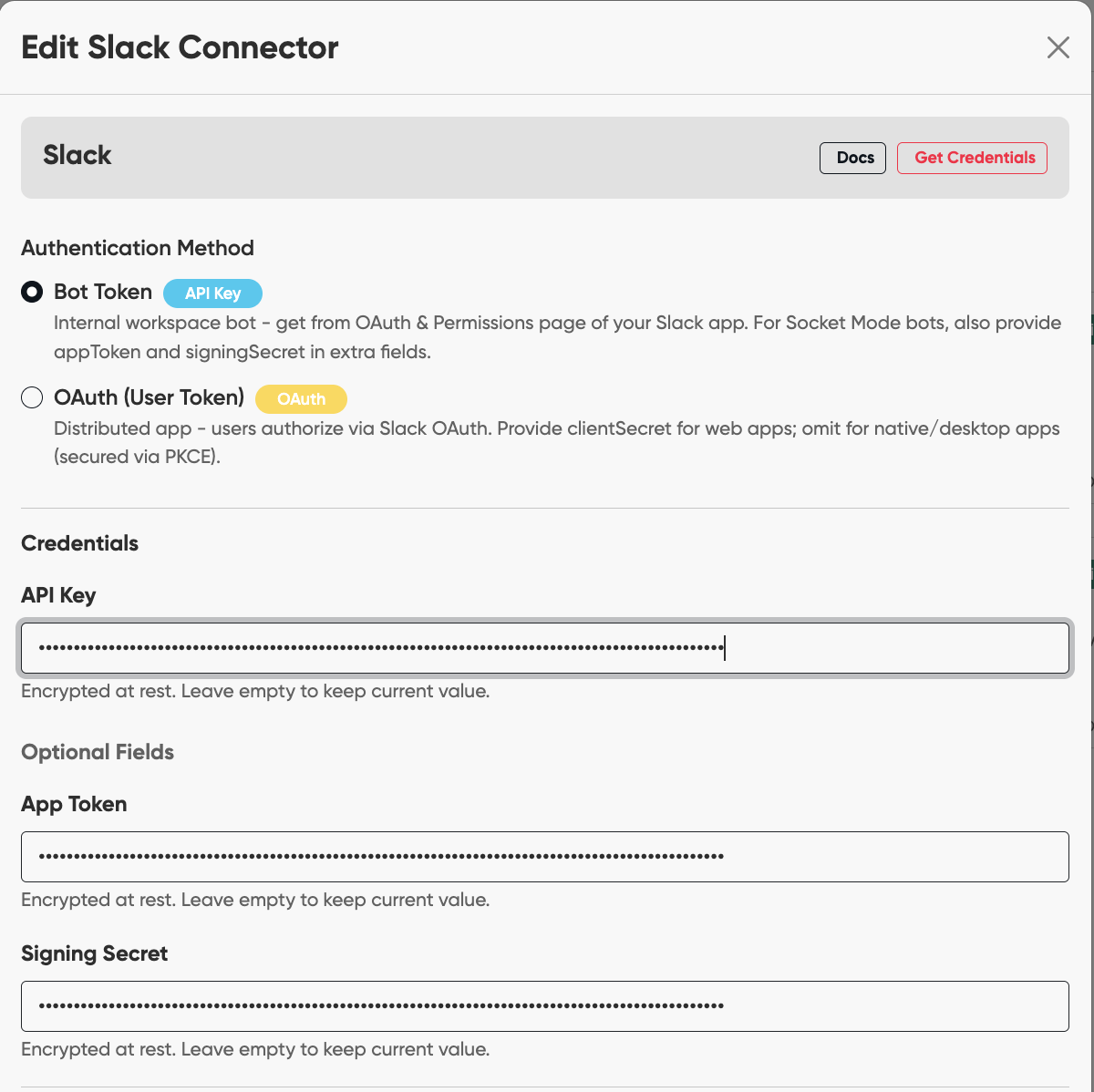 | API Key | Bot User OAuth Token (xoxb-...) — from Step 7 |