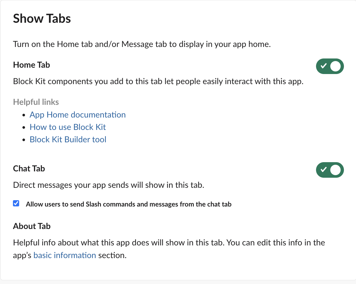 This step ensures that users can send direct messages to your app from its App Home in Slack.