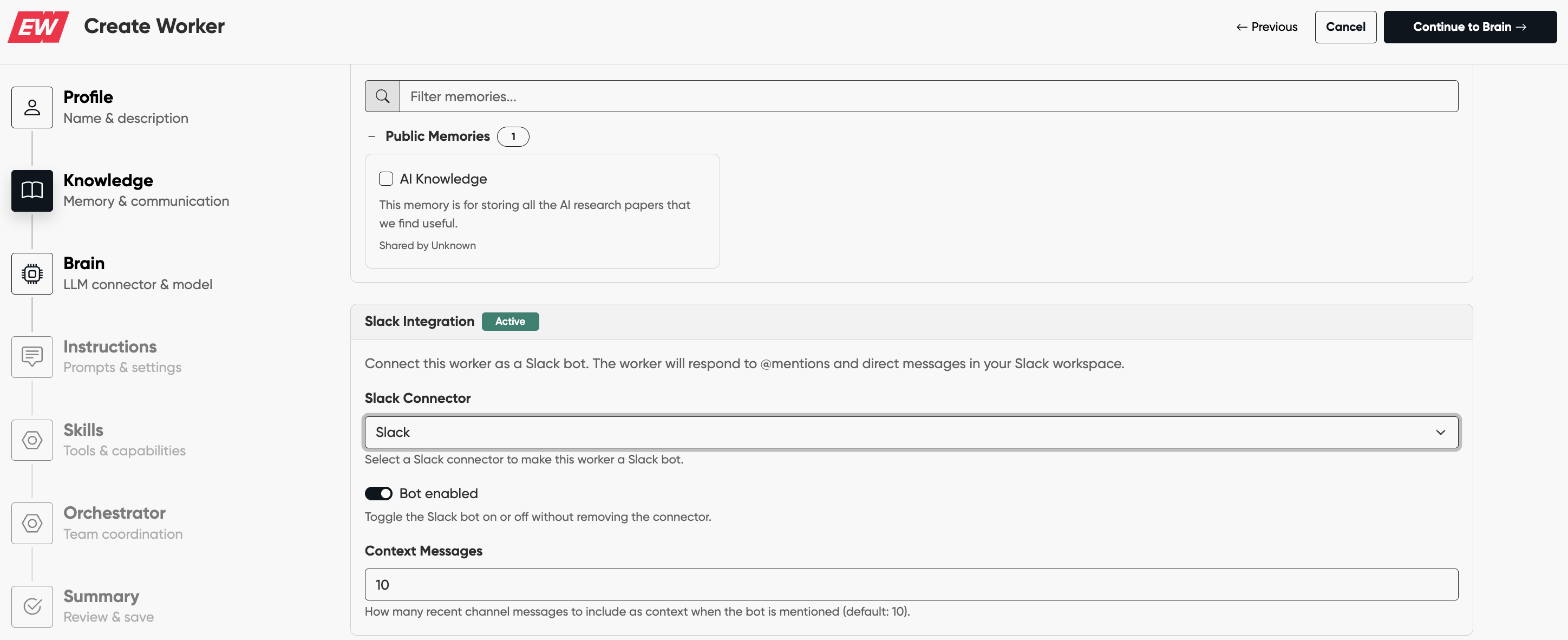- In the Knowledge section enable the Slack integration toggle inside of the AI Worker configuration and assign the Slack connector you just created to the AI Worker.