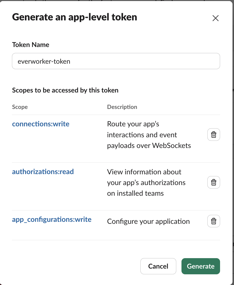 | Connector not working in EverWorker | Double-check that you used the Bot User OAuth Token (starts with xoxb-) for the API Key field, not a User Token. Also verify the App Token and Signing Secret are correct. |