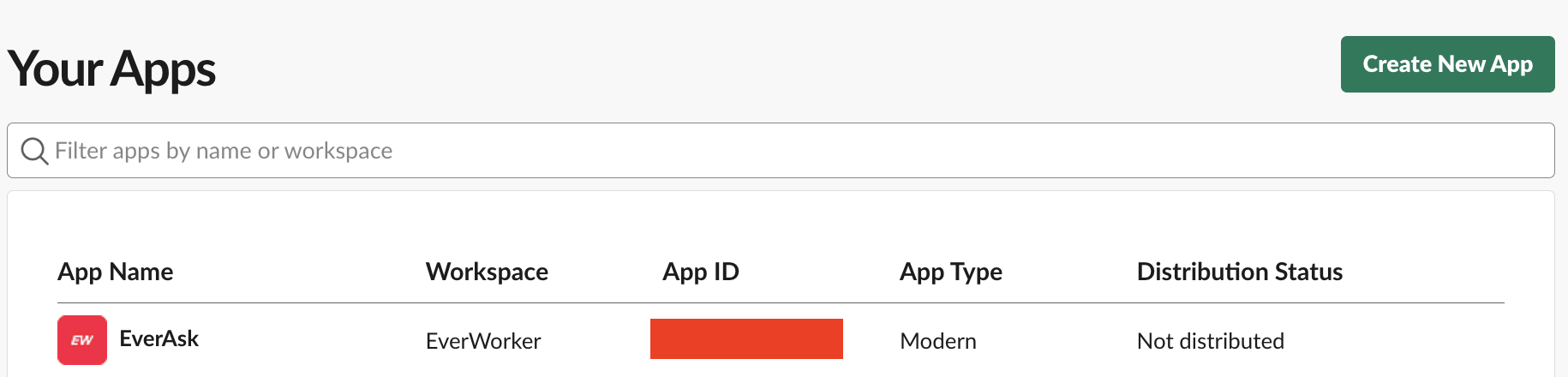 - Go to the Slack API portal and click Create New App.